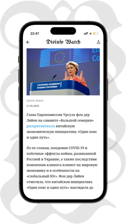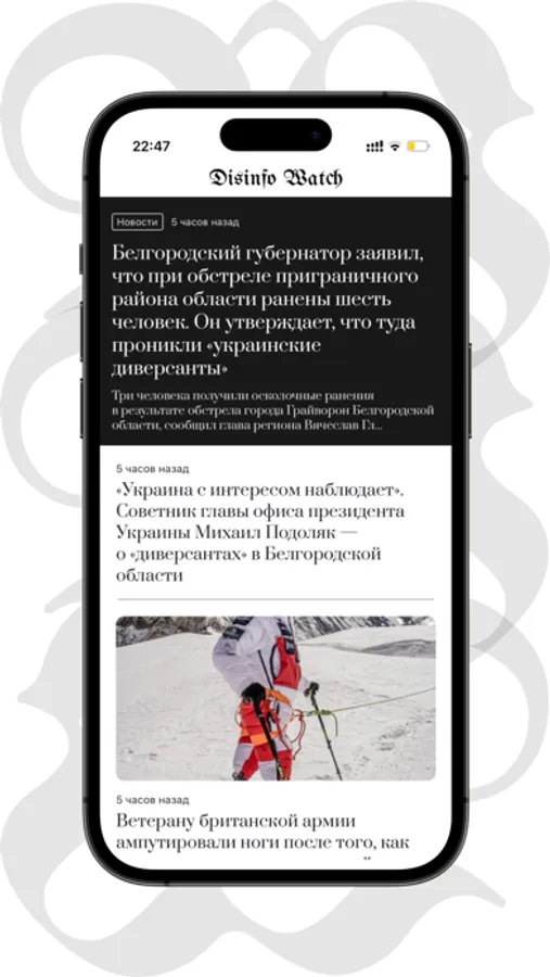 Disinfo Watch — мобильное приложение, которое поможет вам оставаться в курсе всех самых актуальных мировых социально значимых новостей! С развитием информационных технологий и социальных медиа платформ, крайне важно иметь надежный инструмент, который поможет отделить правду от дезинформации.