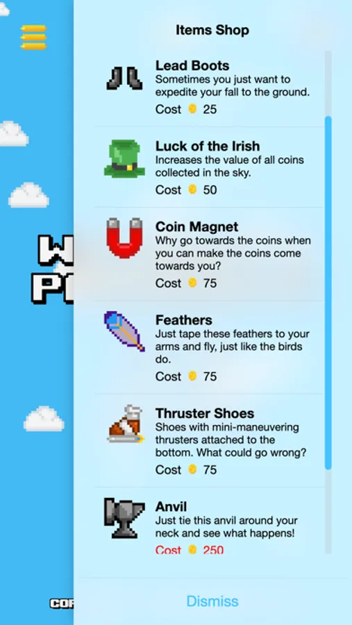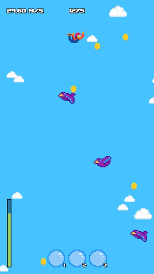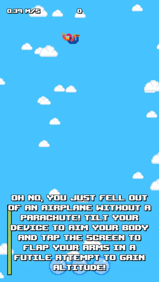 In Without a Parachute, you must flap your "wings" (arms) as fast as you can to try to delay the inevitable. Along the way you can collect coins that will help you buy amazing powerups that will further increase your chances for fame and glory in the skies. Oddly, the item shop does not sell an actual parachute...
