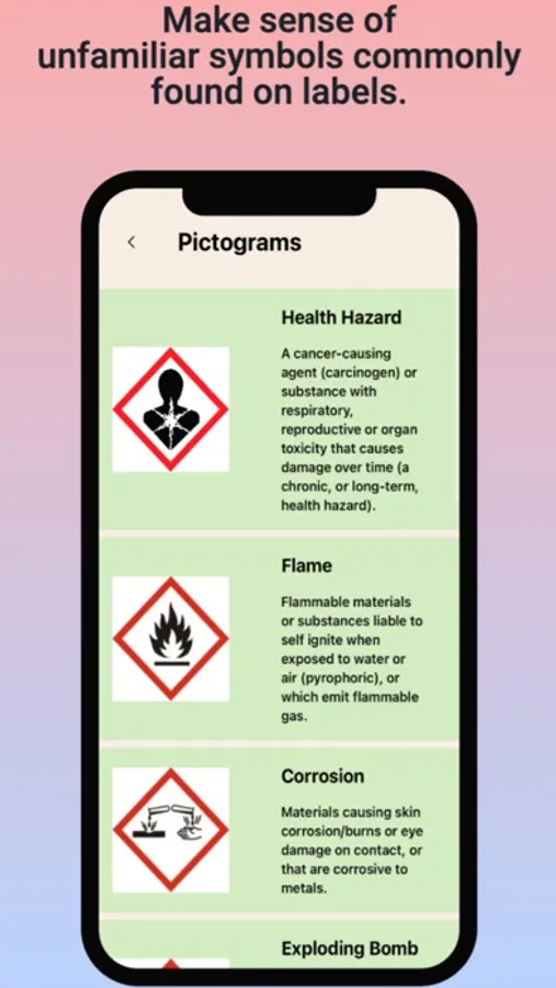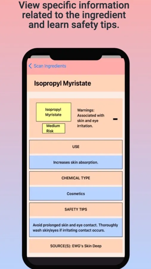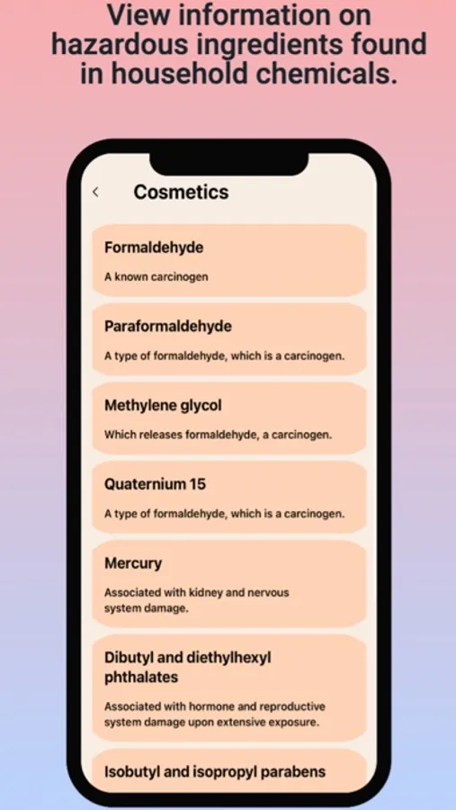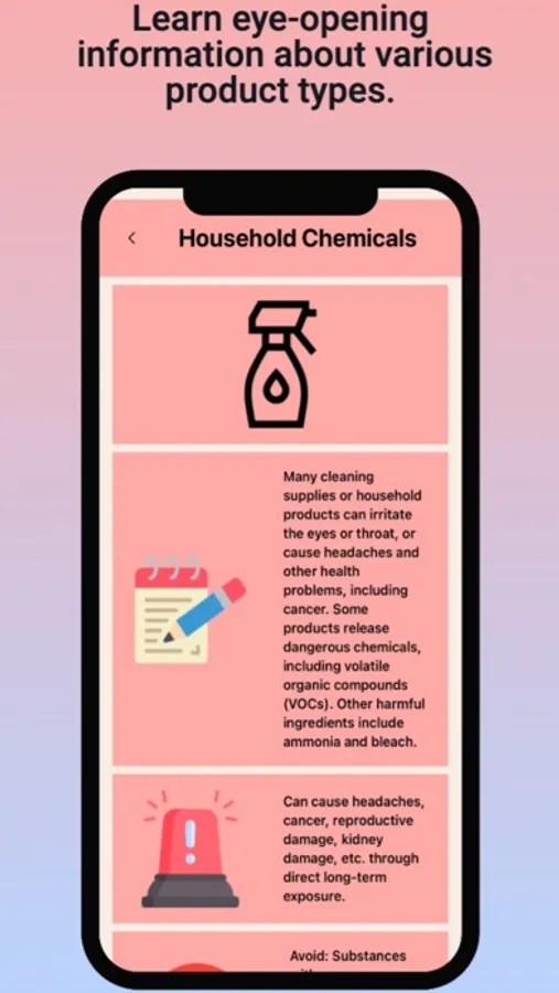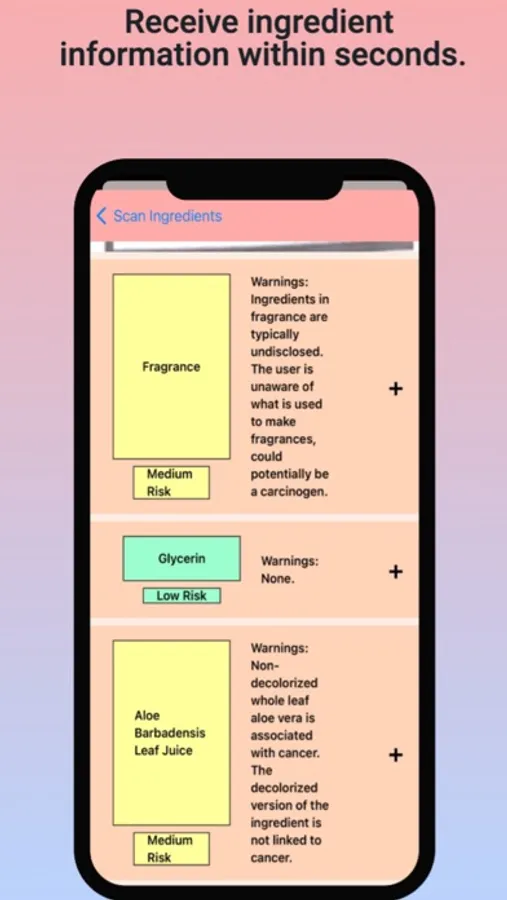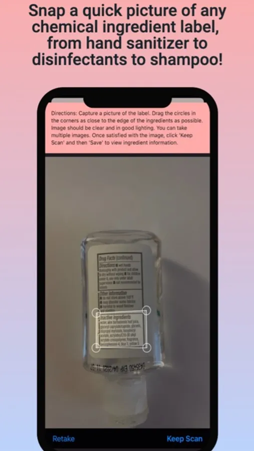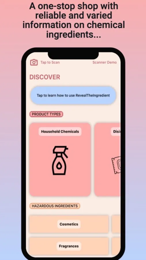 RevealTheIngredient scans chemical ingredient labels and returns information on over 20,000 available ingredients found in chemical products. Press the camera in the top left of the Discover page to take a picture of an ingredient label and obtain information on each ingredient (including ingredients of aerosol sprays, hand sanitizers, hand soaps, face washes, shampoos, toothpaste, and more!). Be sure to tap the "+" button to learn more detailed information on each ingredient. View the cards on the main page to learn more about dangers and safety-measures relating to chemical products.
