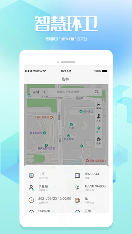 - 车辆管理:车辆的实时位置、实时视频、作业异常报警等;