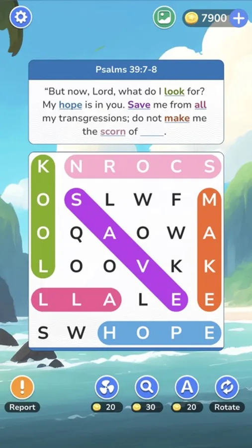 Bible word search games has thousands of diverse and difficult questions, from basic questions to advanced questions, related to books, chapters, verses, characters, events, teachings, and lessons in the Bible.