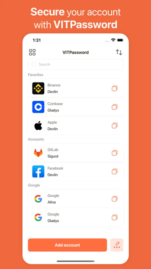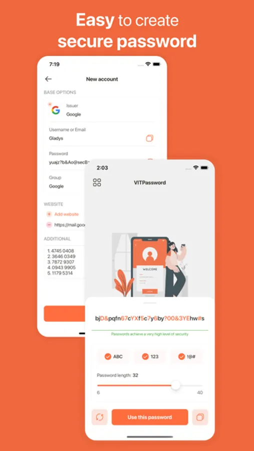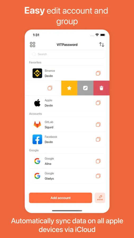 VITPassword is a password management application. VITPassword stores data in your iCloud. In case you lose your phone, you can simply install the app on a new device with the same iCloud Apple account.