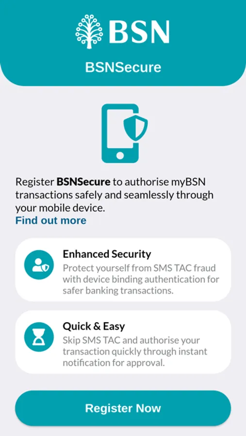 BSNSecure is an easy and secure way to authorise your myBSN Internet Banking. No more waiting for SMS TAC / OTP to authorise your transactions.