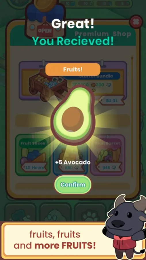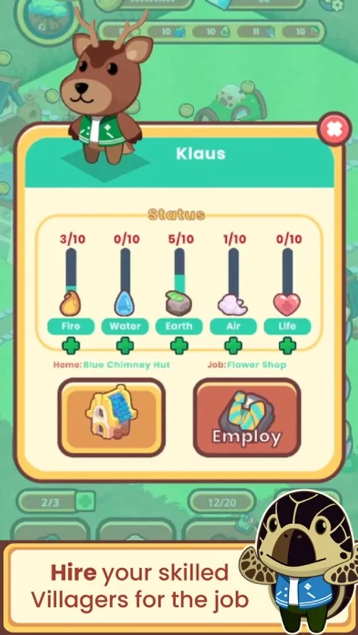 Hire your villagers and feed them fruits to improve their skills, and earn more gold