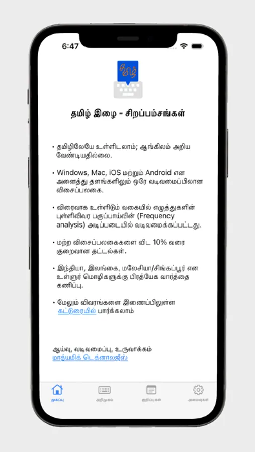 Tamil Izhai is a new Phonemic keyboard for Tamil designed based on frequency analysis of the Tamil Characters. The keyboard is designed to enable intuitive, faster input so as to optimize the hand movements for Tamil input. You can type natively in Tamil without transliterating your thoughts to English.