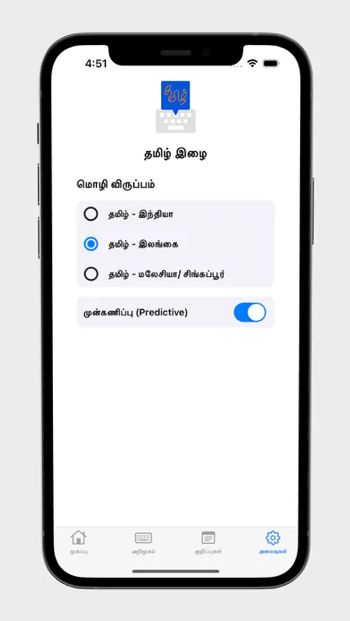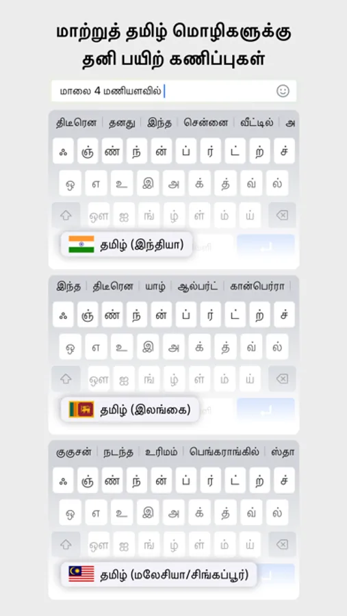 Tamil Izhai has been customised for 3 Tamil variants India (IN), Srilanka (LK) and Malaysia (MY) to suggest current and next word predictions. Stay tuned for cool new features in our next App update.