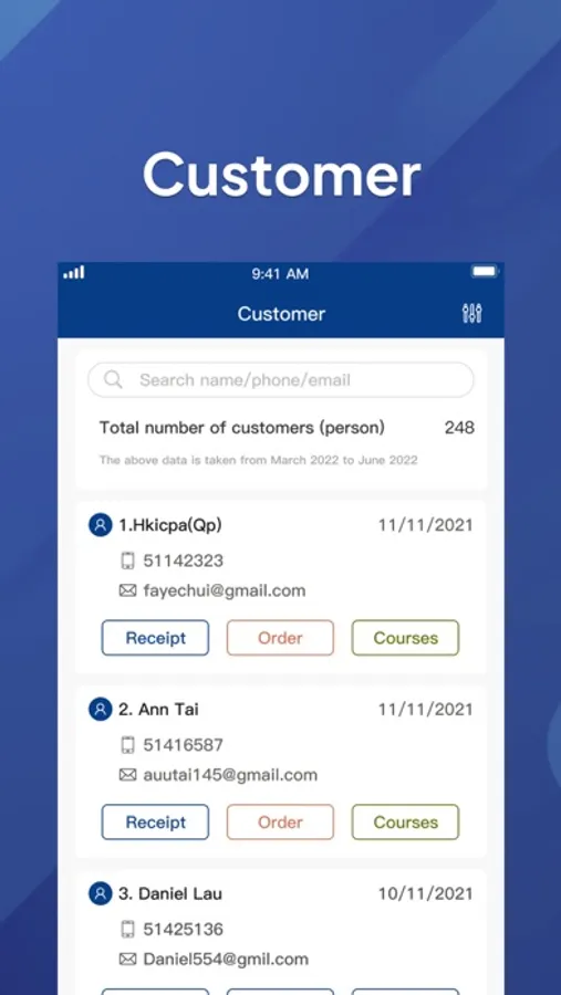此應用程式旨在提供一個簡單方便的平台,讓管理者能夠快捷有效地管理客戶的資料,查看客戶的訂單情況及課程安排。同時通過數據分析幫助企業輕鬆掌握業務營運情況。