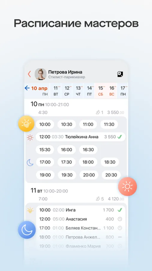 Просматривайте список записей на день к конкретному мастеру, управляйте мотивацией сотрудников.