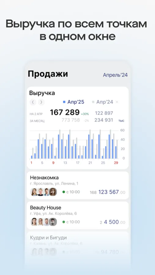 Следите в режиме реального времени за финансовыми показателями любого периода. Мгновенно переключайтесь между заведениями, чтобы быть в курсе динамики продаж каждого.