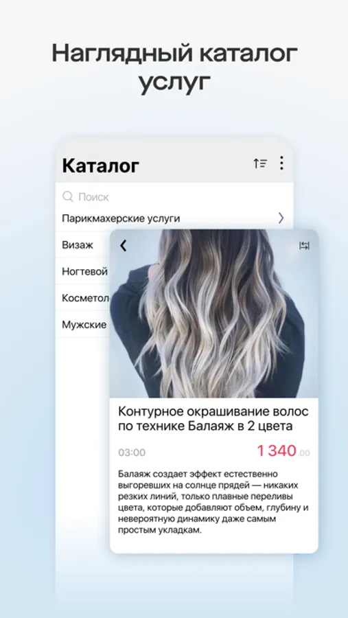 Делите услуги на категории, создавайте карточки каждой услуги с подробным описанием, фото и ценой.