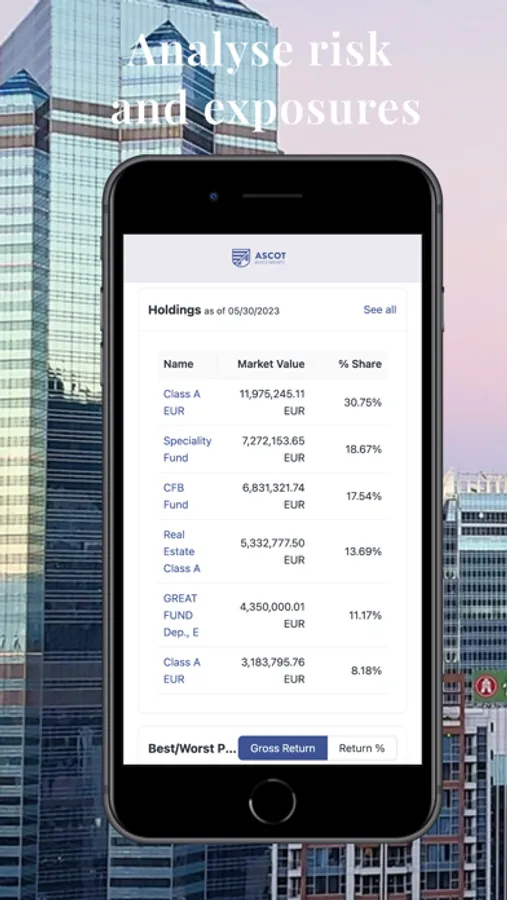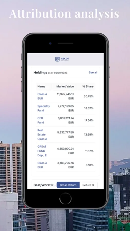 As a valued client of Ascot Investments, we present to you the opportunity for a comprehensive view of all your investments, both liquid and illiquid. Our app is designed to offer enhanced clarity, comprehension, and tracking of your total assets and their evolution.