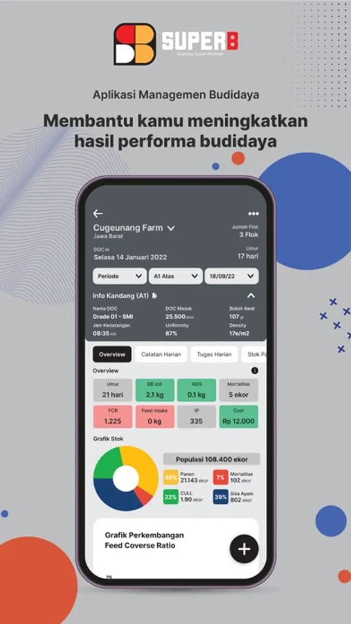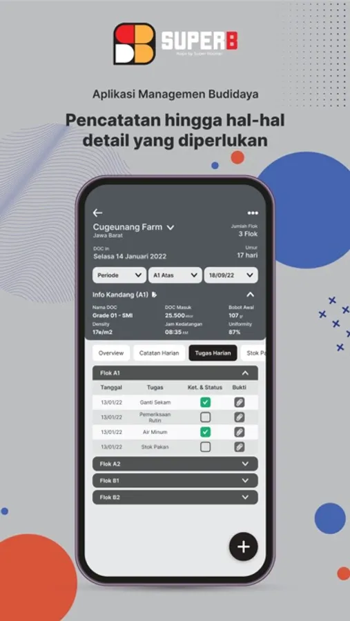 SuperB akan membantu kamu meningkatkan hasil performa budidaya dengan menawarkan sistem pencatatan dan managemen kandang yang lebih mudah dipahami.