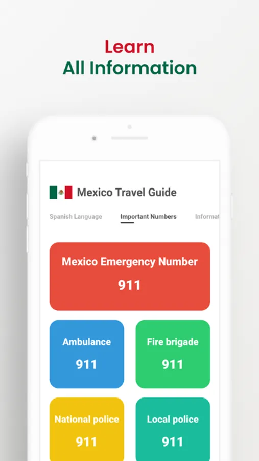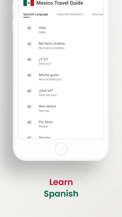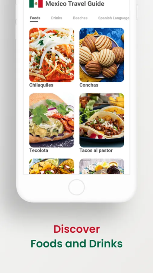 The sections in the application are: Mexico's popular cities, Mexico's popular places, Best Mexican Foods, Best Mexican Drinks, Best Beaches in Mexico, Learn Spanish Language, Informations about Mexico and Important Numbers in Mexico.