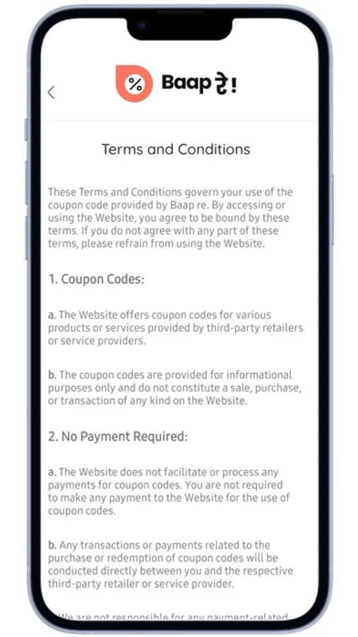 User-Friendly Interface: Navigate Baap re! effortlessly with its intuitive and easy-to-use interface. Seamlessly browse through coupons, track your savings, and manage your referral network.