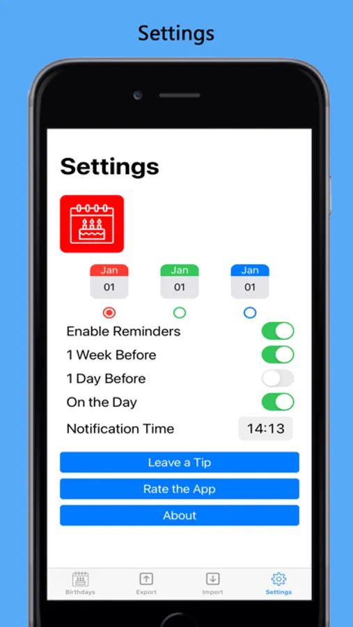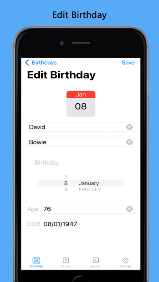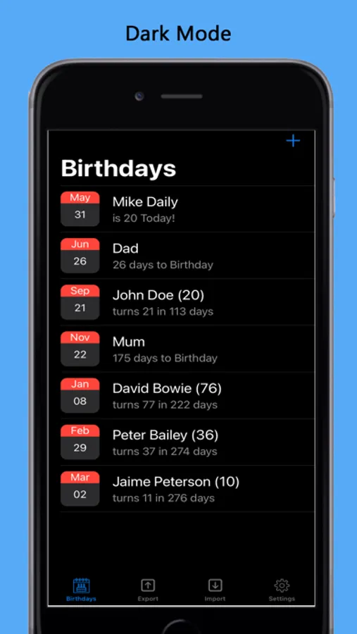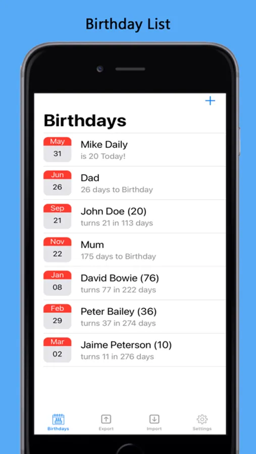 Subscribe to remove all adverts and enable export and import of birthdays. Backup and restore or share your birthday list.