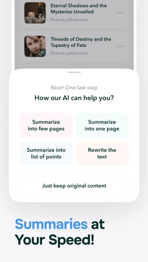 * Customizable Lengths: Whether you're in for a quick glance or a detailed overview, choose from paragraph summaries, page-length digests, expansive insights, or crisp idea lists.