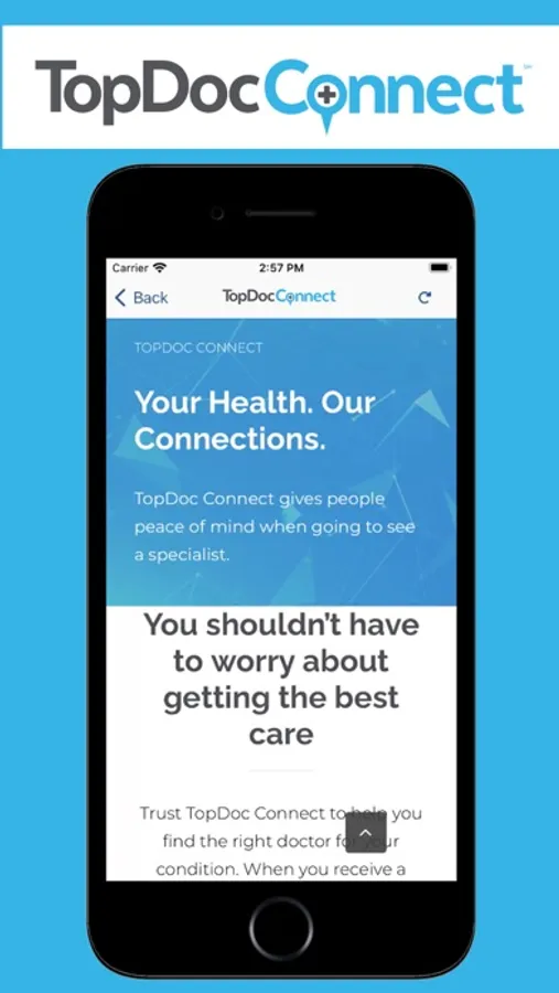 TopDoc Connect is a specialist matching service that helps ArmadaCare members find the perfect physician specialist for their condition, enabling them to avoid misdiagnosis and incorrect treatment. This service produces carefully curated specialist recommendations based on a diagnosis and/or personal preferences. This service is available in select ArmadaCare plans.