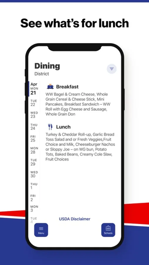Within the dining section, you'll find an easy to navigate, weekly menu, sorted by day and meal type.