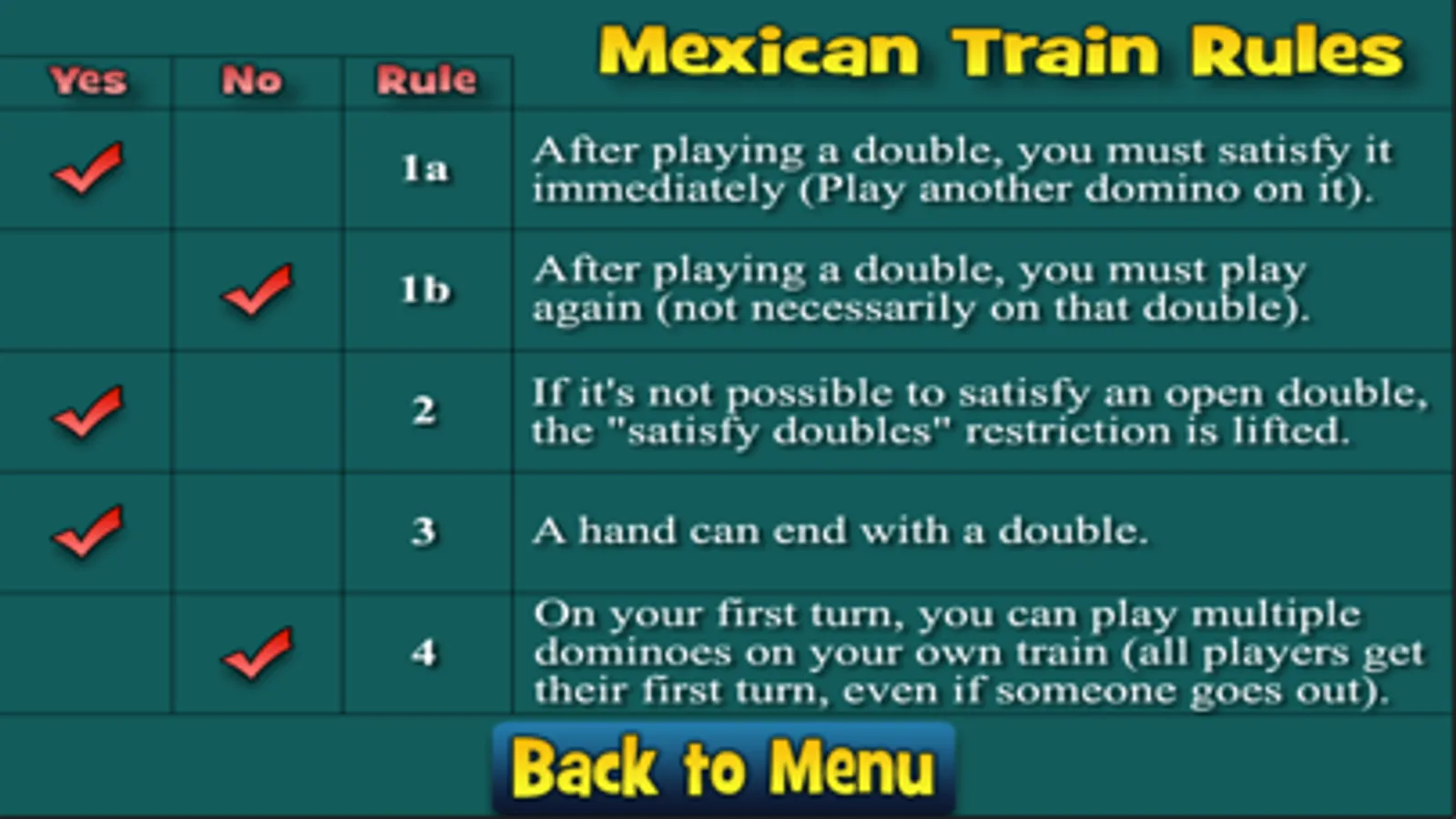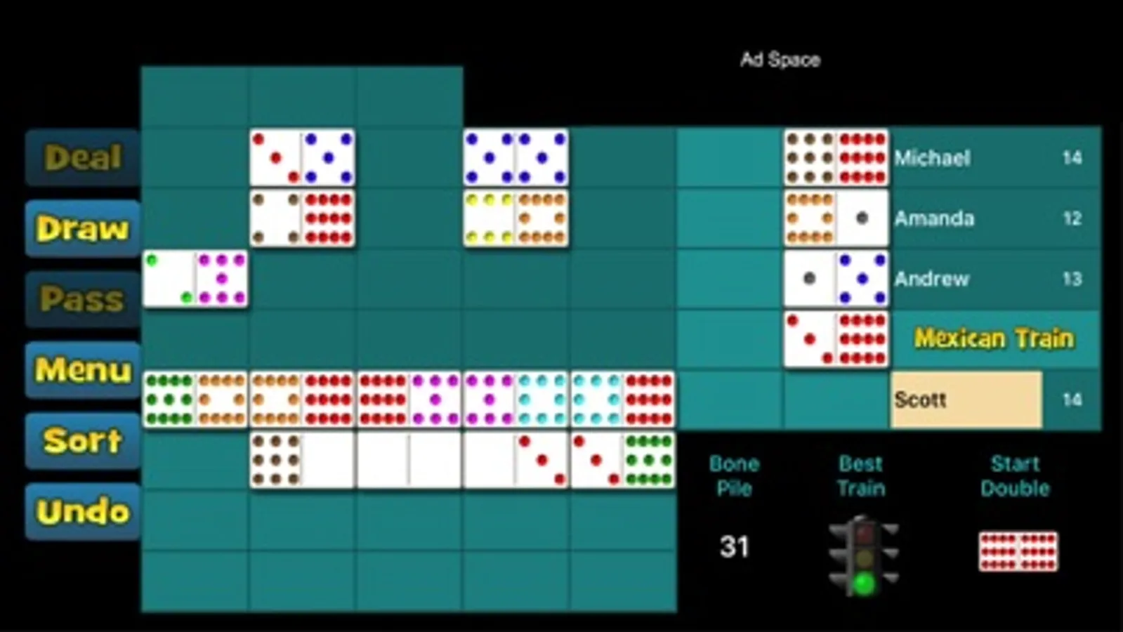 This Mexican Train Dominoes game will run on any iPad, iPhone, or iPod touch. One human player plays against 3 computer opponents of varying skill levels. The "best" train can be calculated by the game so you can improve your play. Many rule variations and options are available. Change the names of computer players. Change the speed of the game. Show numbers on the dominoes instead of pips. Just touch the "Menu" button and then "Help" to learn about all the options. Very addicting!
