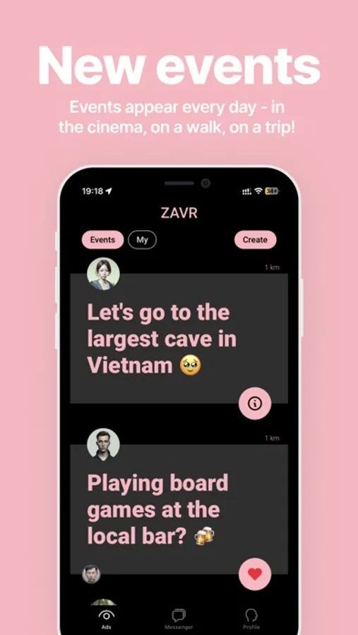 Here, you'll always find company for any activity: going to the movies, taking a walk in the park, or doing yoga. And if you're a avid traveler, this app is made especially for you! Download the app and start creating events right now!