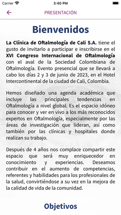 XVI Congreso Internacional de Oftalmología con el aval de la Sociedad Colombiana de Oftalmología. Evento presencial que se llevará a cabo los días 2 y 3 de junio de 2023, en el Hotel Intercontinental de la ciudad de Cali, Colombia.
