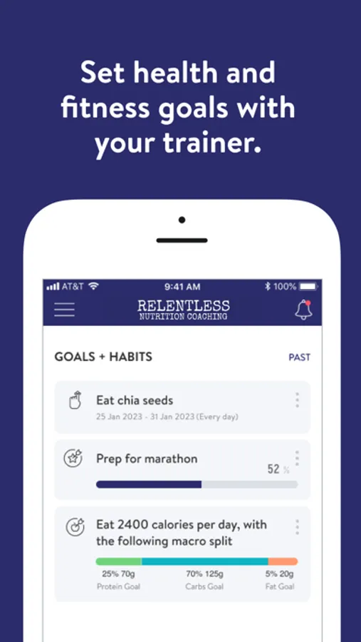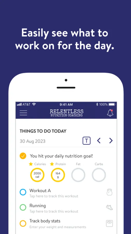 With the Relentless Nutrition Coaching App, you will have access to your nutrition programs designed specifically to help you reach your goals! You can follow and track your nutrition, your workouts, your lifestyle habits, your measurements, and your results–all with the guidance of your coach.