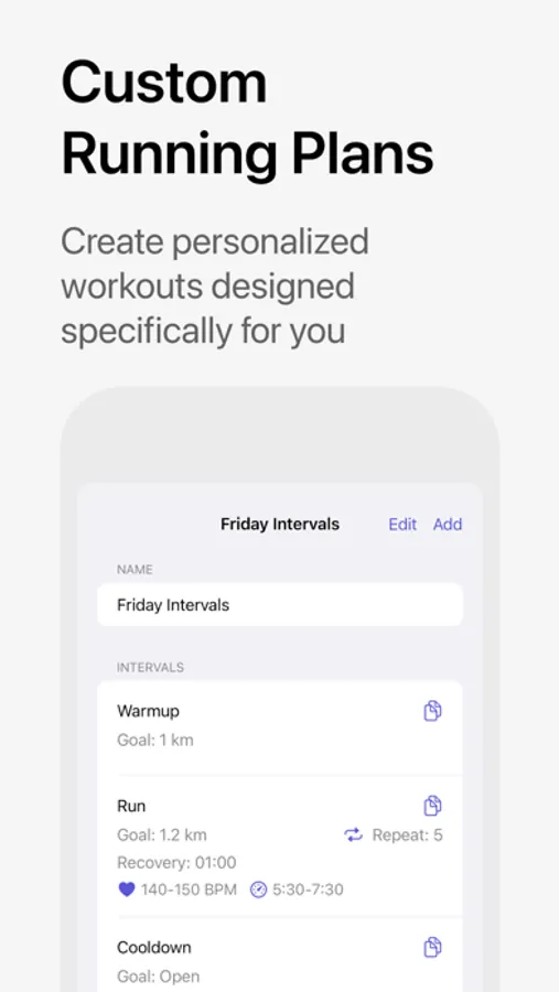 — Create custom run plans. Set the goals for each interval: time, distance, or open goal.