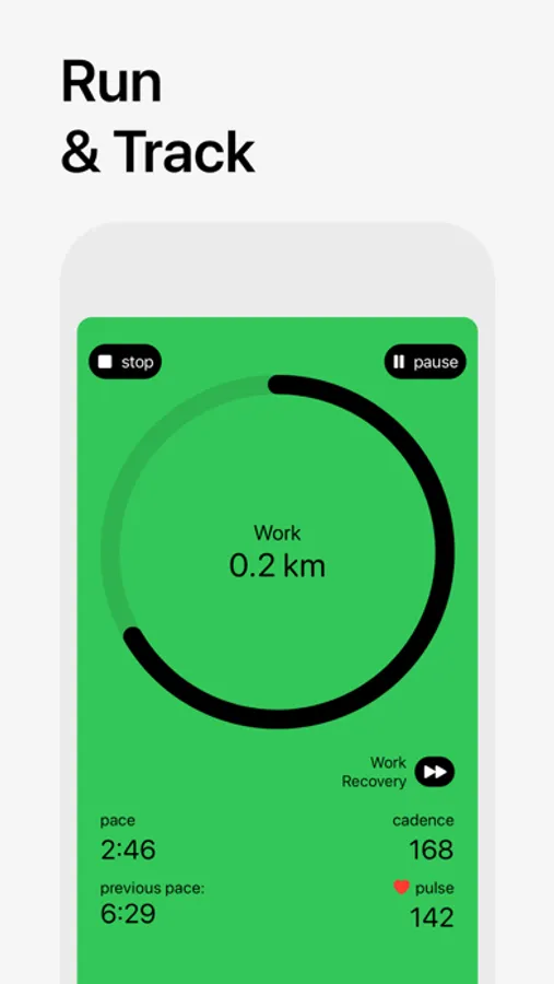 — Run and track: current interval goal, pace, cadence, pulse.