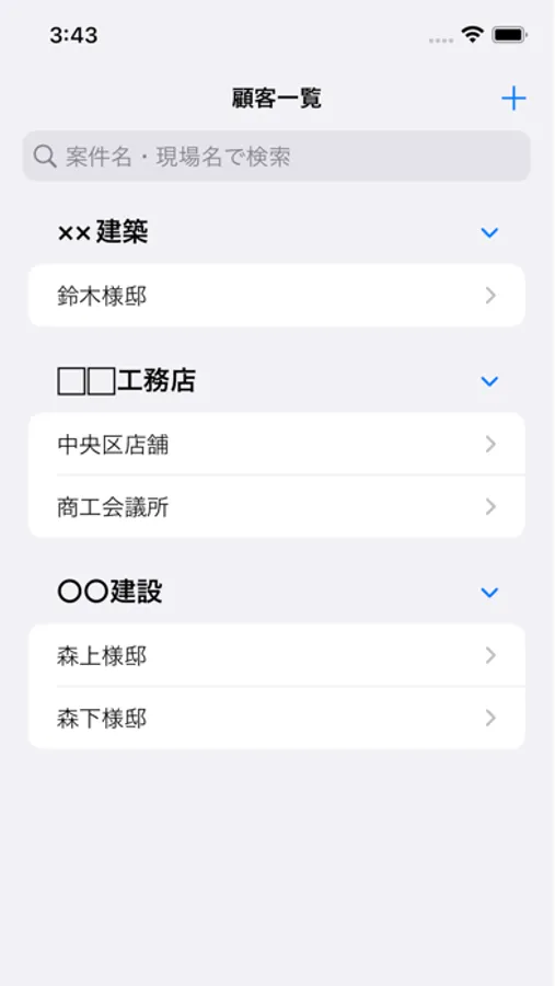 まず、+ボタンを押して、顧客名及び現場名を入力。一度入力した顧客名は今後候補表示されます。