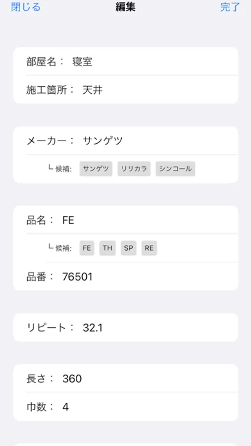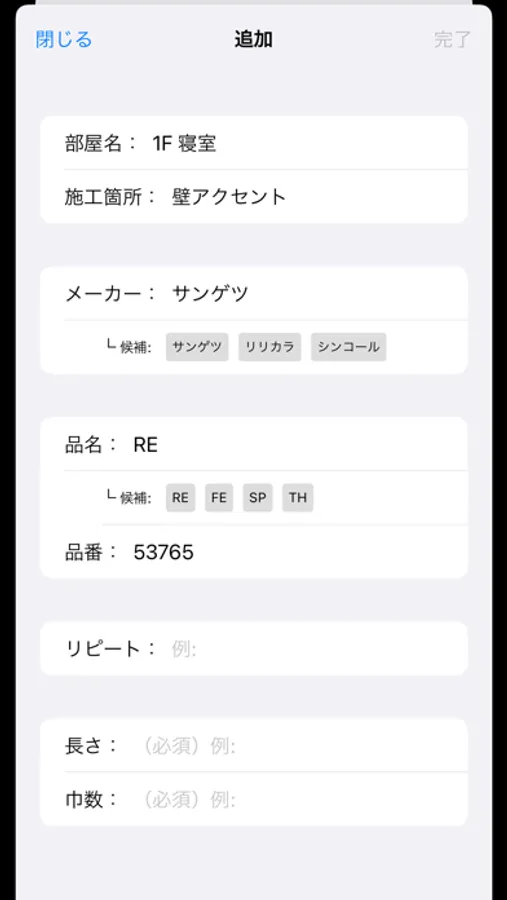 追加するをタップして部屋名(例:寝室) 施工箇所(例:天井) メーカー(例:サンゲツ) 品名(例:FE) 品番(例:77520) リピート(64cm)