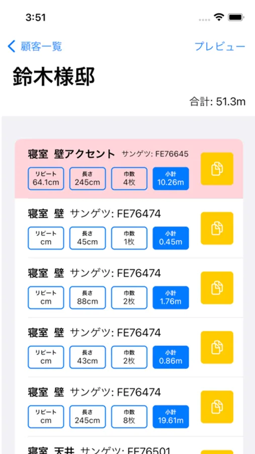 次の入力が同じ部屋、同じ施工箇所、同じ品番の場合、右端の黄色のコピーボタンを押すと、長さと巾数以外のパラメータをコピーして入力を省略できます。