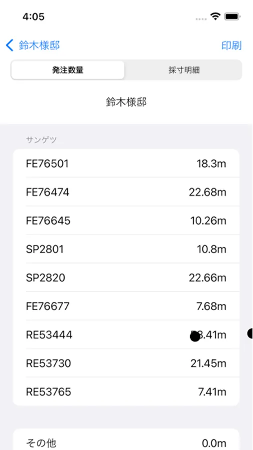 現場でiPhoneに顧客名、現場名、部屋名、施工箇所、品番、リピート、高さ、巾数を入力すれば、品番ごとの集計、部屋ごとの集計、もちろんリピート計算もして発注数量を集計できます。(ステップ柄は非対応)