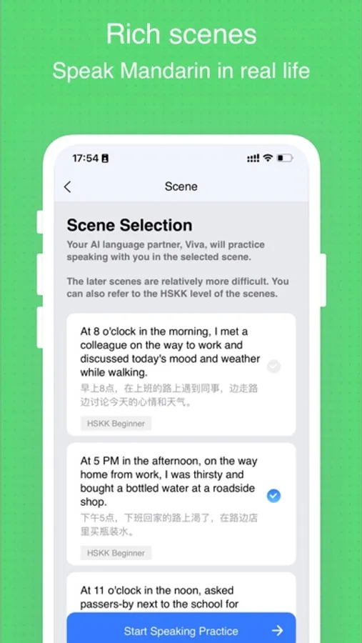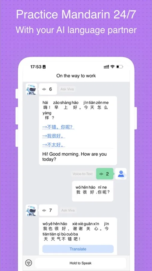◉ Oral practice in real-life scenes: with Viva, you can practice speaking Mandarin Chinese in everyday situations such as work, shopping, and socializing. Don't worry about not being able to respond, Viva will teach you how to reply and make Chinese conversations easy. Viva has native Mandarin Chinese pronunciation, is always online and available, no hourly fees needed.