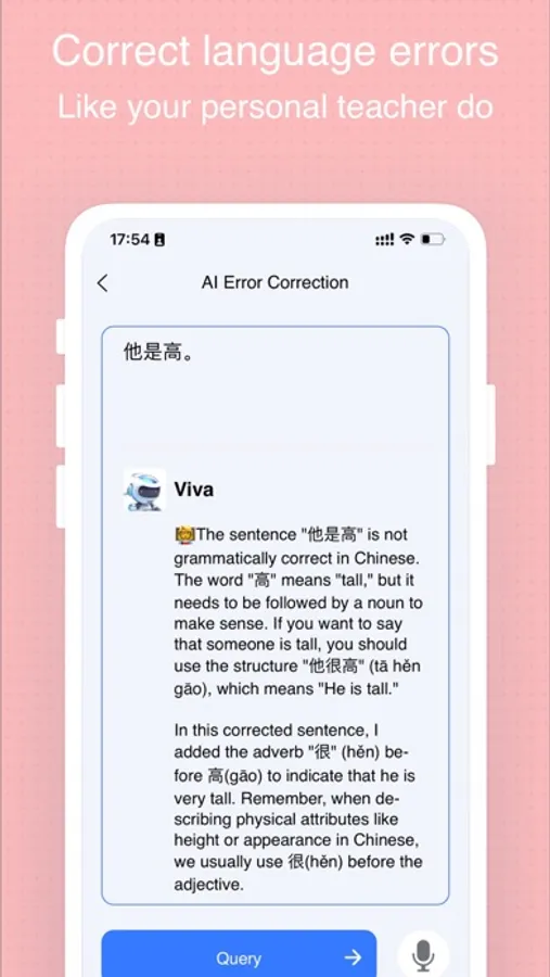 ◉ AI Error Correction: Viva can help you correct any mistakes you make in your Chinese learning. It can correct the sentences you speak or write and provide the correct ones.
