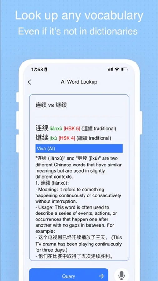◉ AI Word Lookup: Viva can explain almost all Chinese vocabulary and phrases, even those not found in any dictionary. Using "vs", you can compare any two Chinese words and quickly learn synonyms and antonyms.