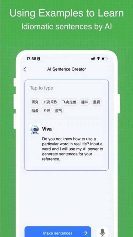 ◉ AI Sentence Creator: Viva can write practical example sentences for all the words that may appear in the HSK and HSKK exams, and automatically translate them into your native language.