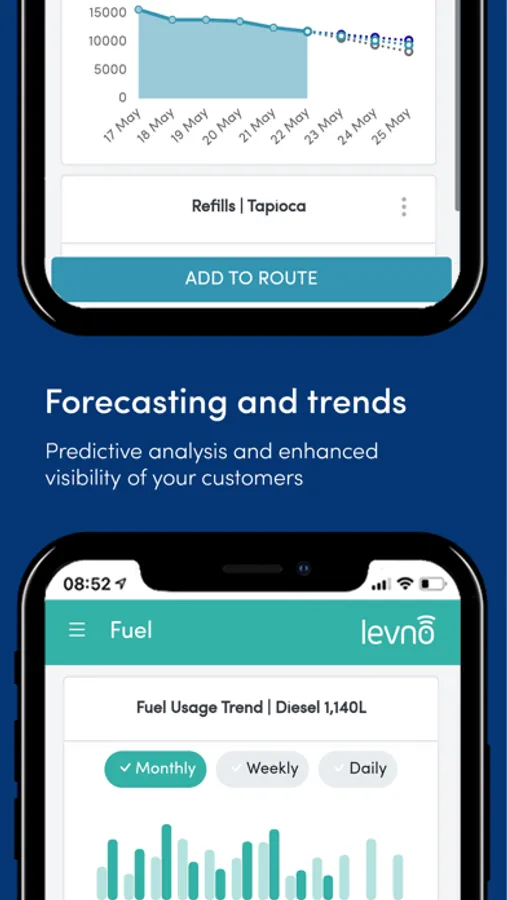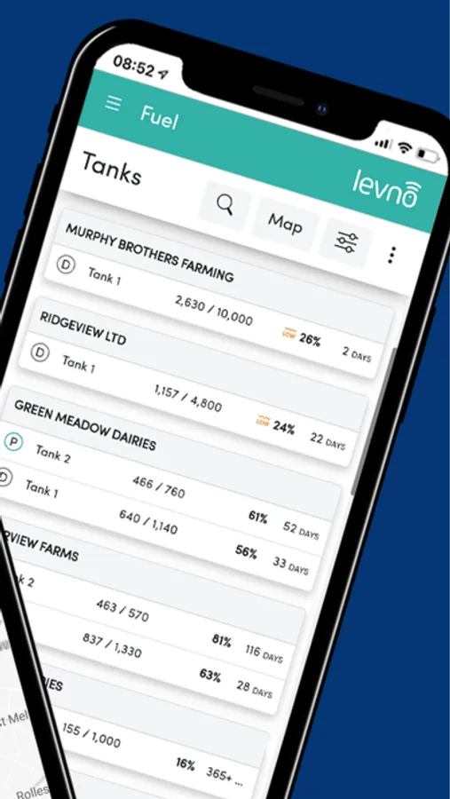 Gain complete visibility over your customers’ fuel tanks with Levno for Fuel. Monitor customers’ usage, activity, and days until empty, so you can ensure they never run out of fuel. The Levno platform aligns with scheduling and logistic systems, helping you to optimise logistics and reduce transportation costs.