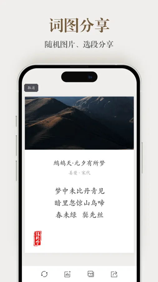 随时分享自己喜欢的词句,为你的照片配相关的诗词并分享出去。