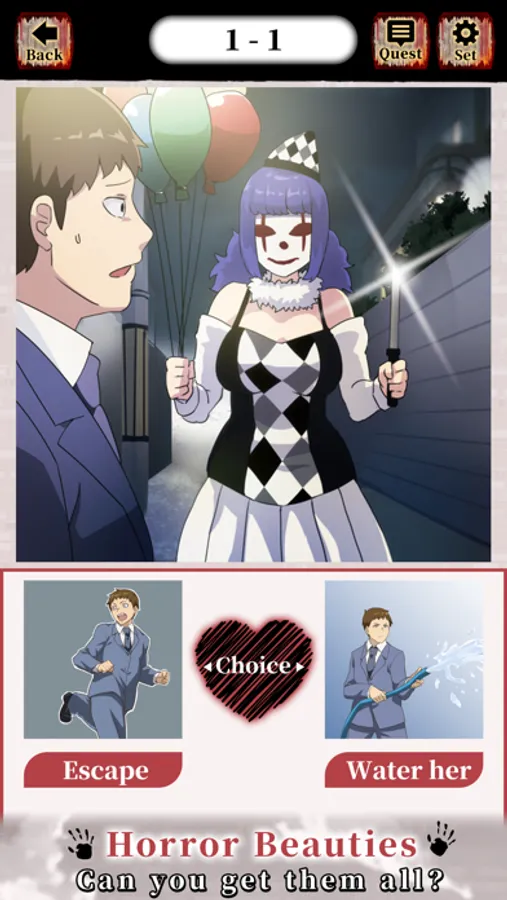 DATING! Horror Beauties!' is a quiz game in which you have to choose between 2 choices to make the horrifying beauties (yokai, monsters and ghosts) happy!