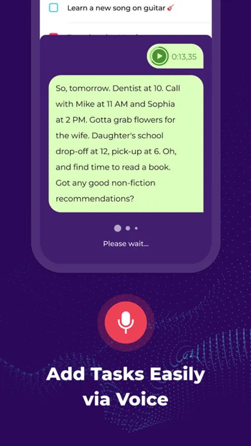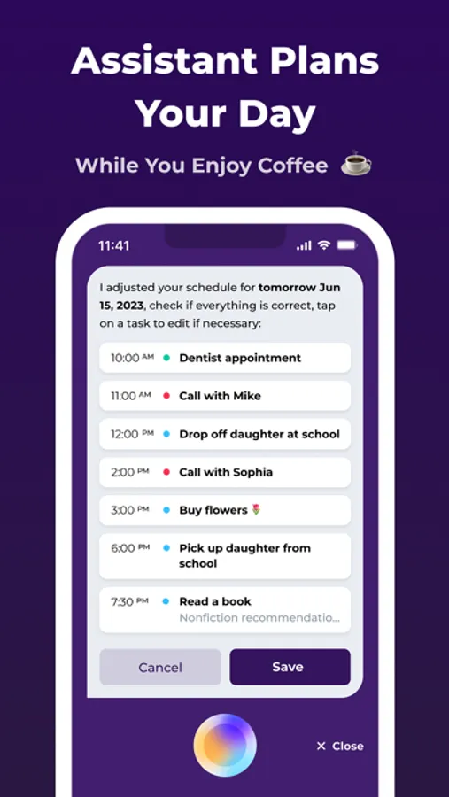 Day Flow is a game-changing daily planner; instead of manually typing out your day's plan, just voice your tasks and plans for the day or week, and your schedule is ready in a snap. Just say something like: «Tomorrow dentist at 10AM. Call with Mike at 11 AM and Sophia at 2 PM. Gotta grab flowers for the wife. Daughter's school drop-off at 12PM, pick-up at 6PM. Oh, and find time for 15 minutes meditation." And voila, your assistant will arrange it all, keeping you on track all day.