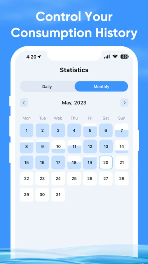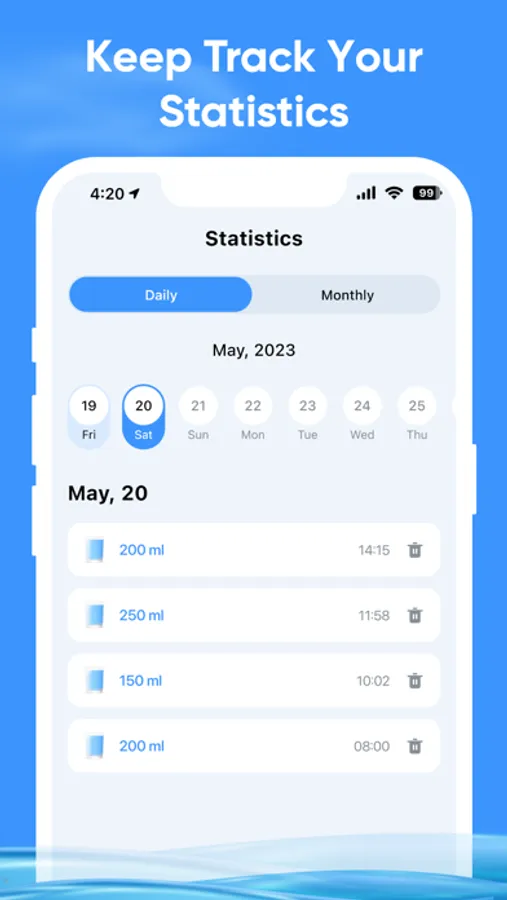 - Daily Water drinking history: Daily Hydro Tracker records the user's drinking history through each day. Users can view information about their water intake during a specific time period to track their progress and analyze their drinking habits.
