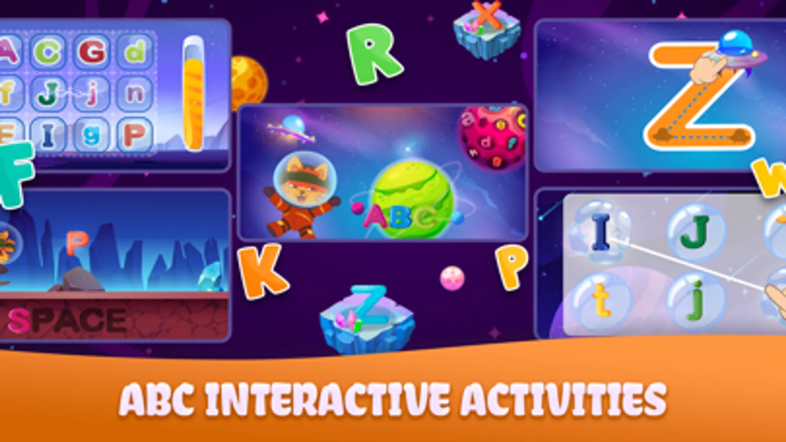 Cosmic ABC Learning: Embark on an interstellar journey to learn the alphabet in a space-themed environment. From your child will discover hundreds of cosmic characters and new words while playing and having fun with letters uppercases and lowercases.