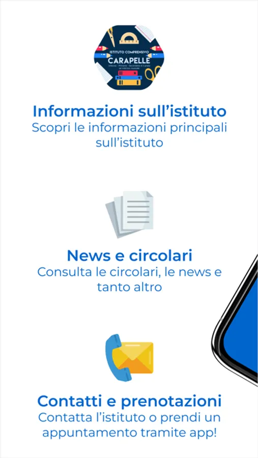 Scopri l'app dell'Istituto Comprensivo Carapelle. Potrai visualizzare tutte le informazioni e i contatti dell'istituto, consultare i contenuti, ricevere notifiche push in base al tuo ruolo e ai tuoi interessi, accedere allo sportello digitale e prenotare un appuntamento con la segreteria o la presidenza.