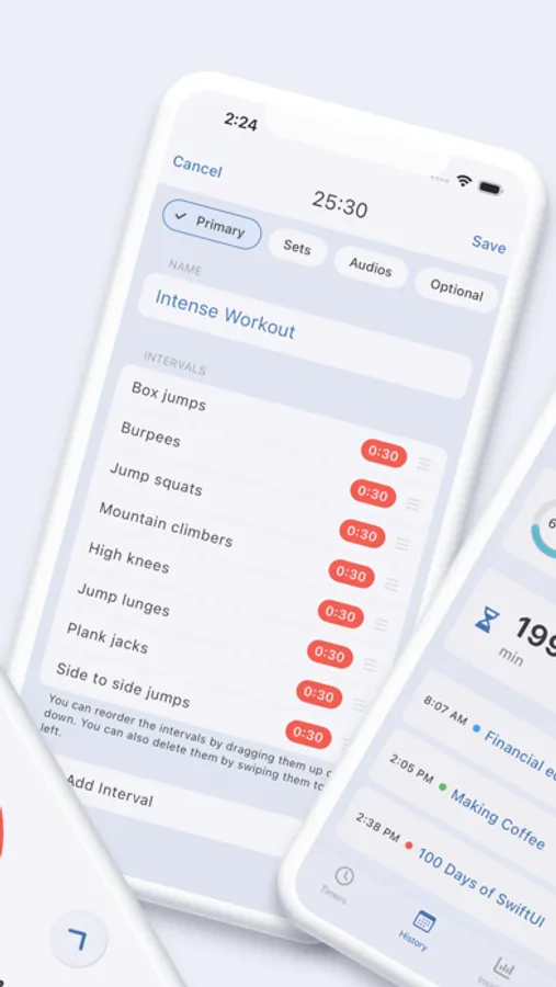 - Customize audios for each interval, sets, and rest periods to stay motivated and on track