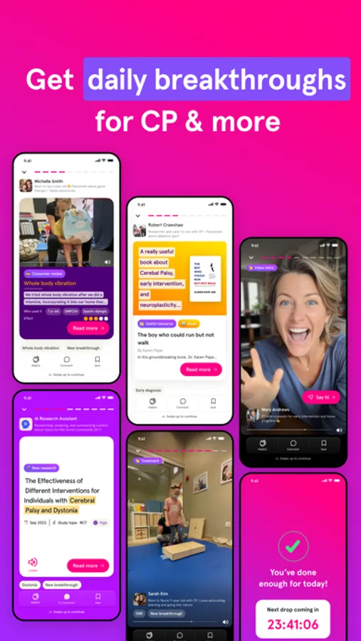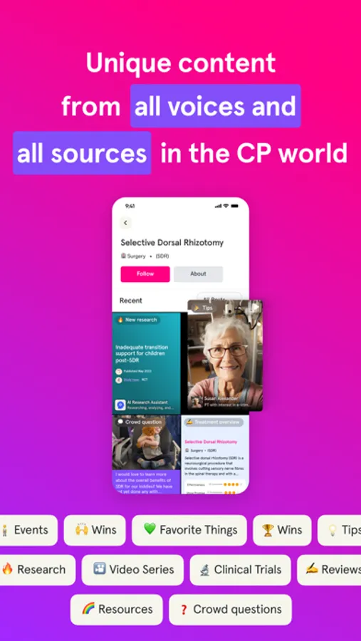 • Discover content ranging from events to research, user tips to video series, all in one place. Connect with diverse voices, including health consumers, adults living with CP, clinicians, and researchers.