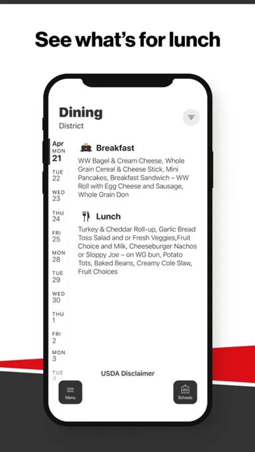 Within the dining section, you'll find an easy to navigate, weekly menu, sorted by day and meal type.