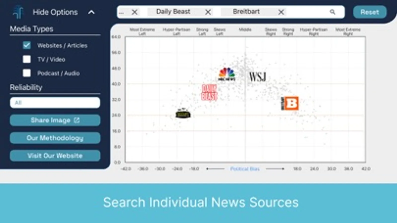 1. Interactive Media Bias Chart: Search thousands of sources including websites, podcasts, and TV shows with an easy-to-use navigation bar. Quickly identify news outlets’ positions, providing a clear overview of their bias and reliability.