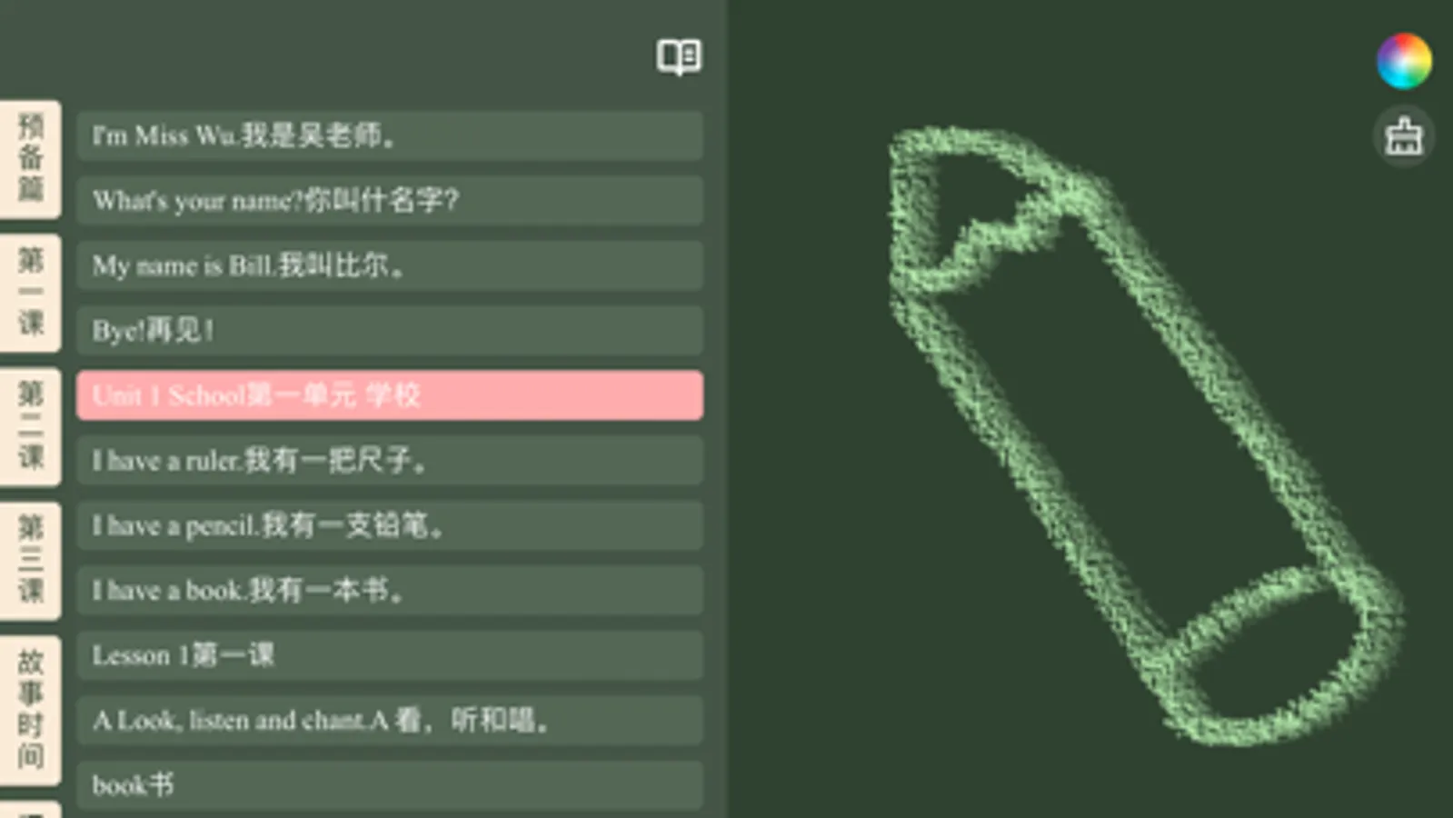 《小学英语-黑板读写》是一款适合家长带着小孩学英语的应用。应用内有丰富的听说读写功能,支持手写输入,能促进家长和孩子之间的感情交流。同时,应用提供画笔选择、单元切换等辅助功能,让小孩在轻松愉悦的氛围中学习英语,提高语言表达能力。是家庭英语学习的好帮手。