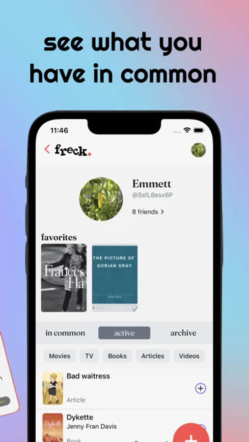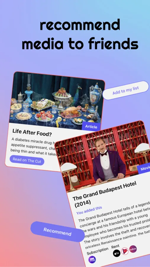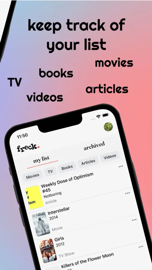 Kiss that musty Notes App list goodbye! Keep track of the movies, books, articles, and videos you want to read or watch with Freck. Freck tells you relevant information about each movie/book/show/link on your list, remembers who recommended it to you, and checks which of the 5837246 streaming providers out there have it.