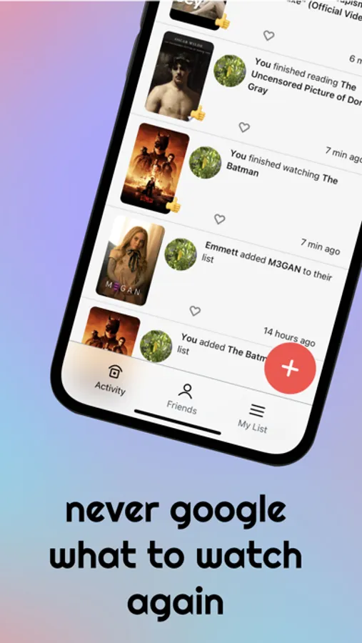 Check out what your friends have read or watched recently and add it to your list. Their taste in media is probably almost as good as yours!